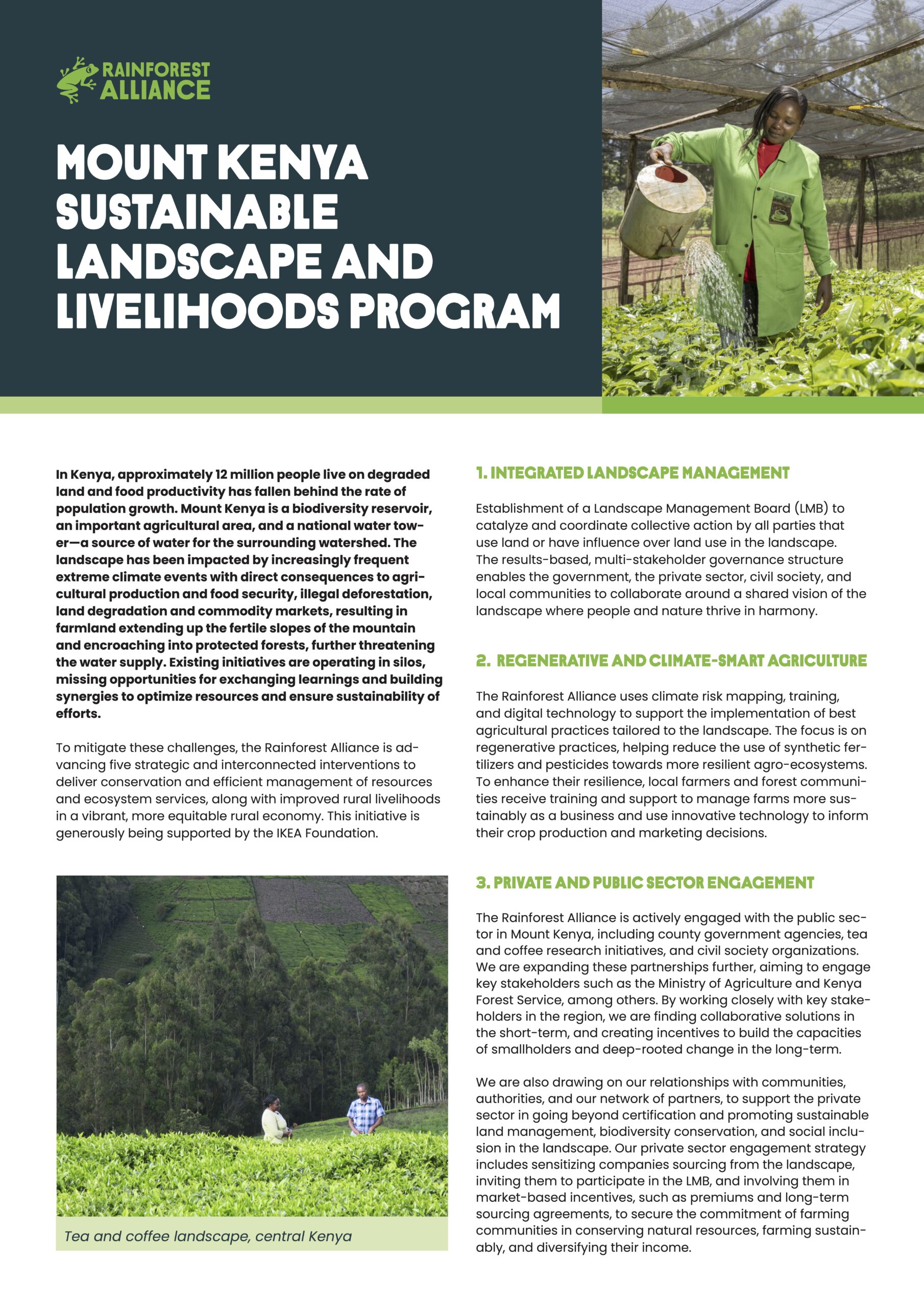 In Kenya, approximately 12 million people live on degraded land and food productivity has fallen behind the rate of population growth. Mount Kenya is a biodiversity reservoir, an important agricultural area, and a national water tow-er—a source of water for the surrounding watershed. The landscape has been impacted by increasingly frequent climate events with direct consequences to agricultural production and food security, illegal deforestation, land degradation, and commodity markets, resulting in farmland extending up the fertile slopes of the mountain and encroaching into protected forests, further threatening the water supply. Existing initiatives are operating in silos, missing opportunities for exchanging learnings and building synergies to optimize resources and ensure the sustainability of efforts.
